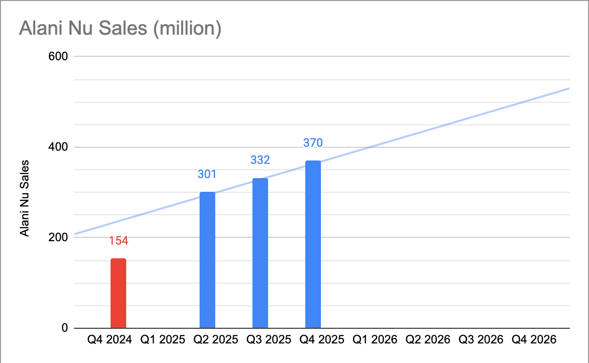 In high growth story, I typically use a conservative projection of simply inter-poling absolute numbers. You can observe in this case that Alani Nu sales are adding $35 million sequentially pretty consistently. Assuming this scenario, sales in 2026 could be 390 million (adjusted for seasonally weak Q1), 425 million (conservative), 460 million, 495 million. In this straight line linear projection, Alani sales would be $1770 million.