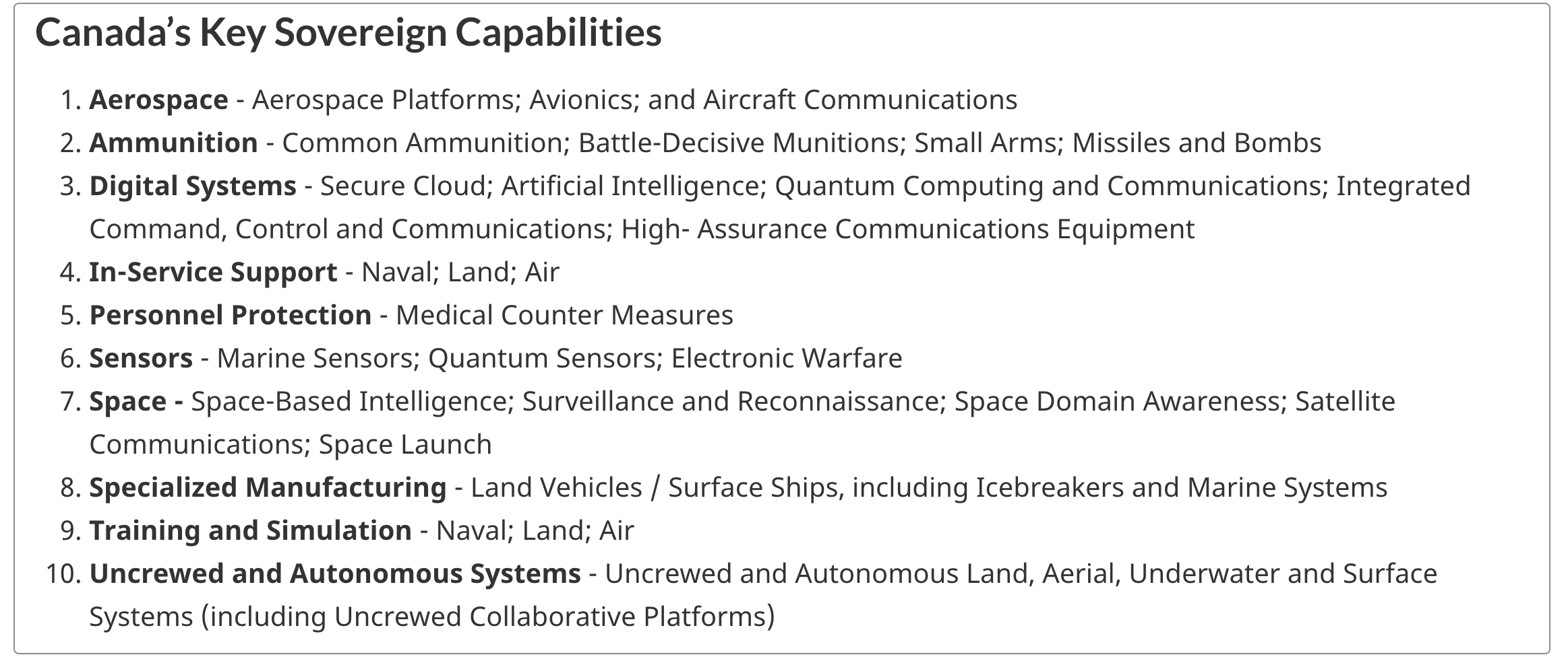 Canada has published this week the Defence Industrial Strategy. The strategy has identified key sovereign capabilities. The following is an initial list of the sovereign capabilities for which the new DIA will be prioritizing build-in-Canada. Going forward, the Government’s designation of sovereign capabilities will not be static; it will evolve with the threat landscape, capability needs, technological change, and domestic industrial capacity.