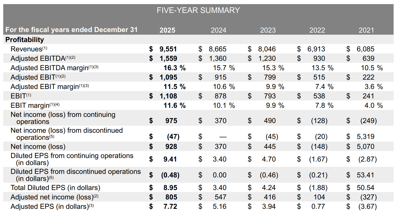The following five-year summary demonstrates the radical turnaround that occurred in 5 years. If you look at the top line, since 2021, the CAGR was 12%. However adjusted EBIT margin went from a very low 3.6% and has climbed steadily to 11.5%.