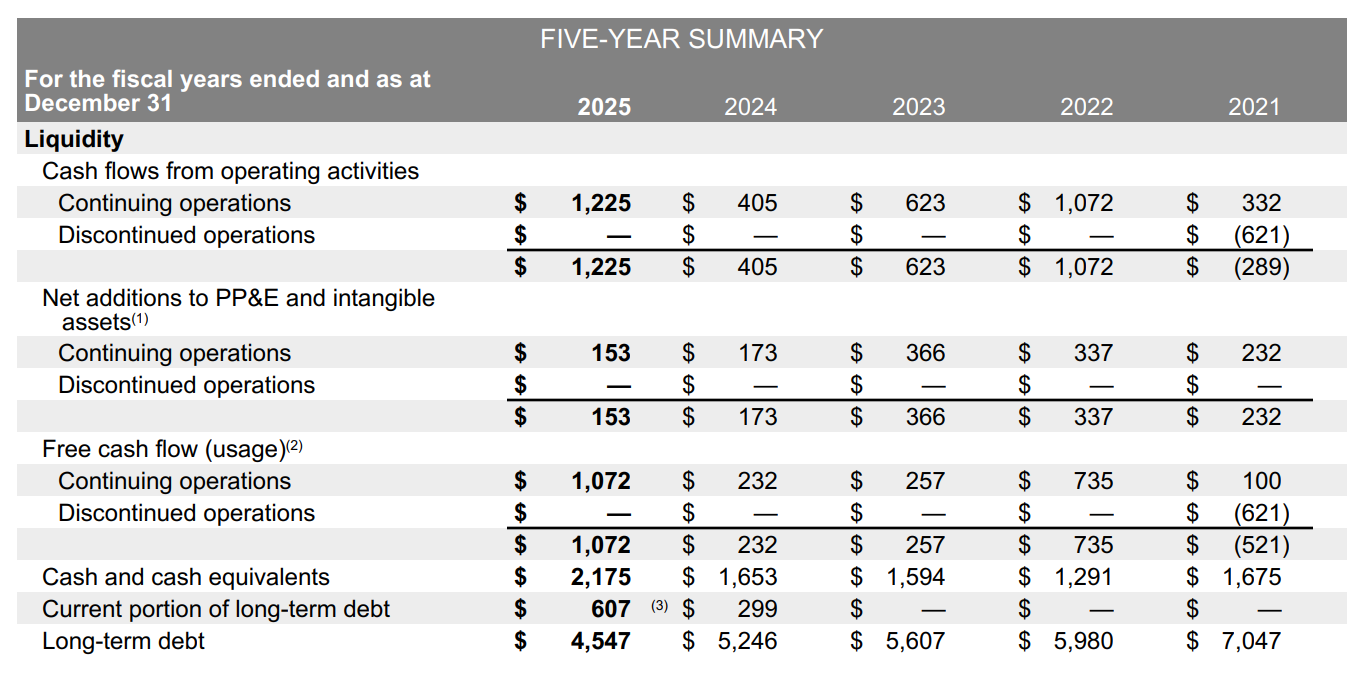 The following 5 year liquidity table is impressive. In 2021, Cash flow was negative 289m (including discontinued operation) and became 1225m in positive cash flow in 2025. Free cash flow was 1072m. Long term debt was reduced by 2.5B while net cash subtracting the current portion of long term debt was stable.