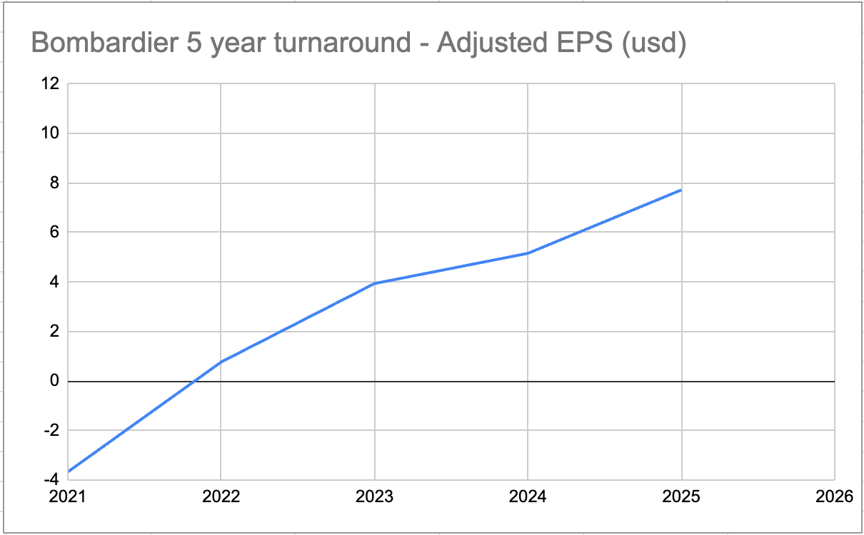 This should be acreditive to the net income for 45m annually or about 0.45USD on earnings in 2026… roughly. If Bombardier would repay its debt completely over the next 5 years as it could, they will save roughly 400m USD in interest of 4USD in EPS. This is a possible scenario in a low double digit growth scenario. Bombardier dont pay tax due to large accumulated loss.. 4USD is 5.50 CAD at current rate so Bombardier adjusted EPS would go from 10.57CAD today to 16CAD or 52% higher just by repaying debt.