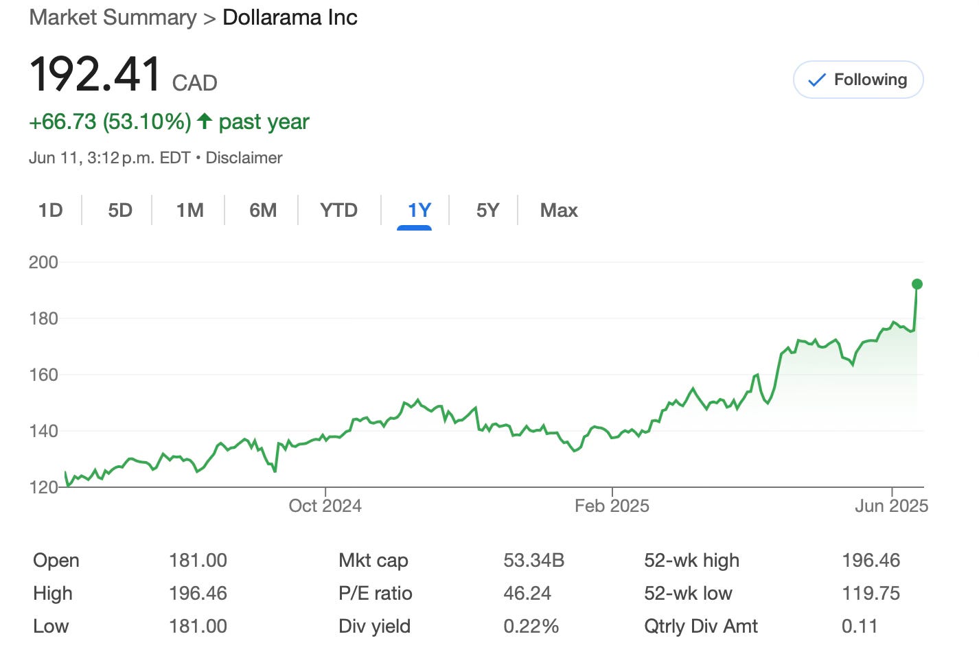 The valuation is quite high at 43x trailing earnings, but put it in your watchlist, and next time Mr Mussolini south of the border derails the stock market, you may get a chance to get a few shares. Dollarama is totally immune to the tariff shitshow in my opinion.