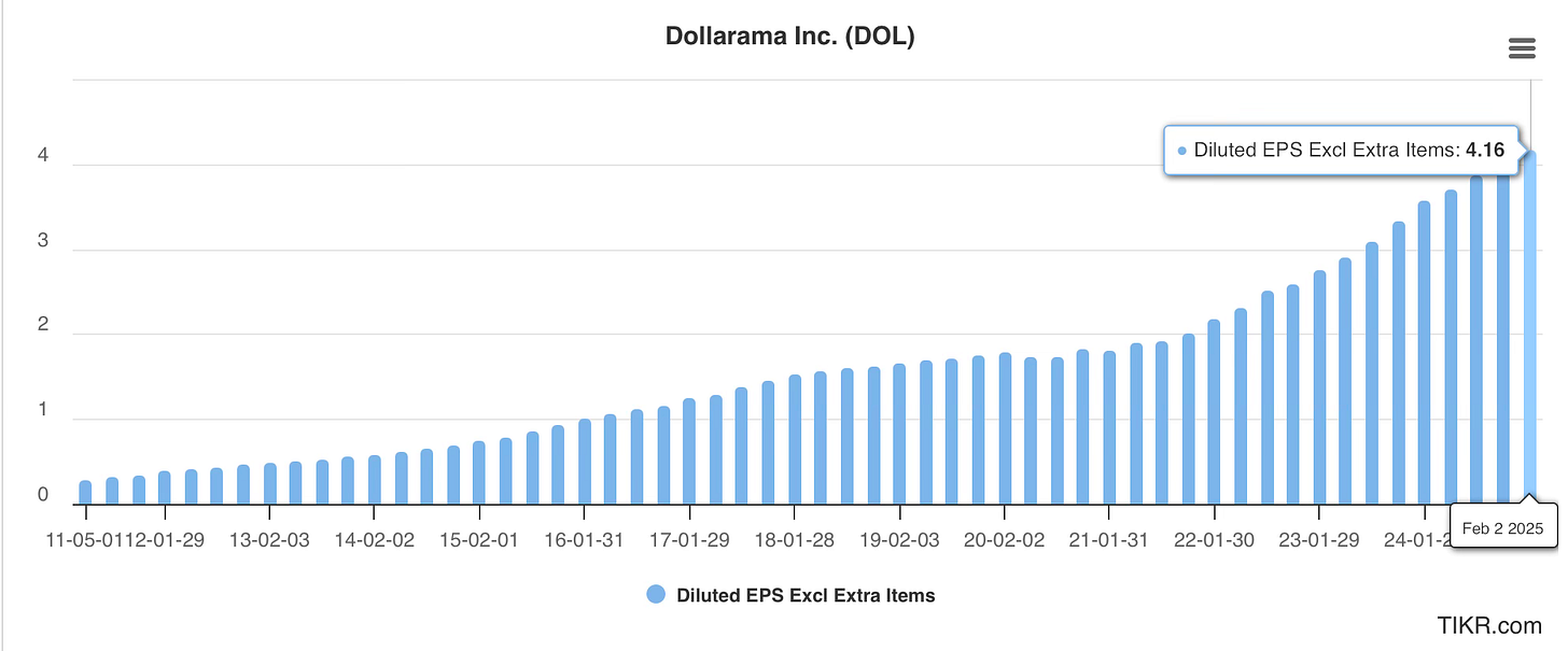 To summarize, Dollarama is a beast in the retailer space, compounding at an impressive level with no down year since it became public in 2009 as shown below. It is not well known, but I am surprised that it has not yet achieved a cult status in the stock market. If you include today’s result, which is not shown in TIKR yet, the 12 mo EPS is now 4.39$.
