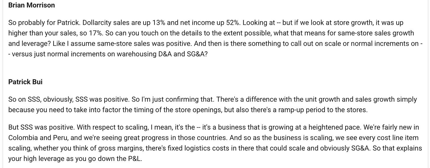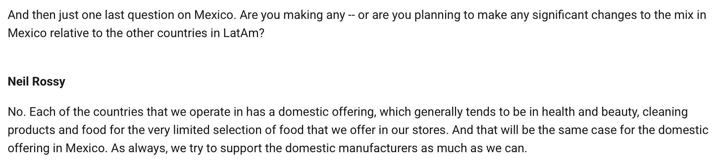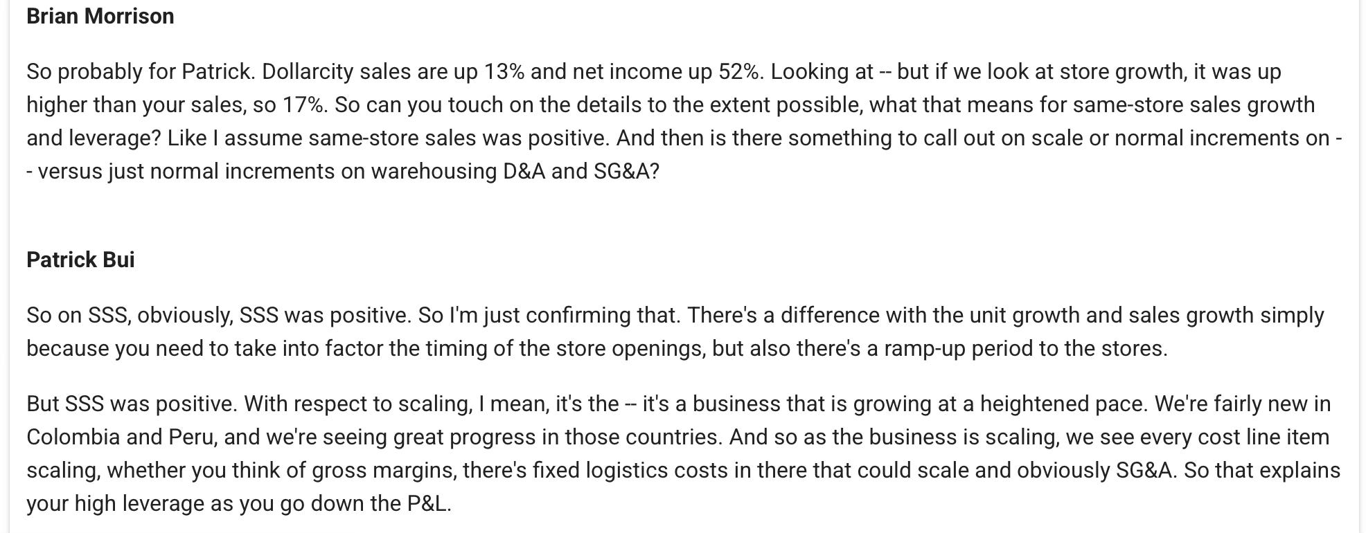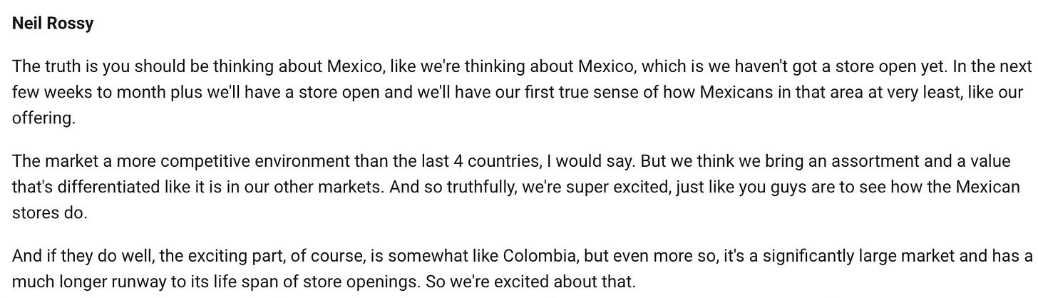 Some colours on how Dollarcity is performing: ie. operating margin gain, SSS positive, still quite new in Columbia and Peru. So Guatemala and El Salvador are the orignal countries.