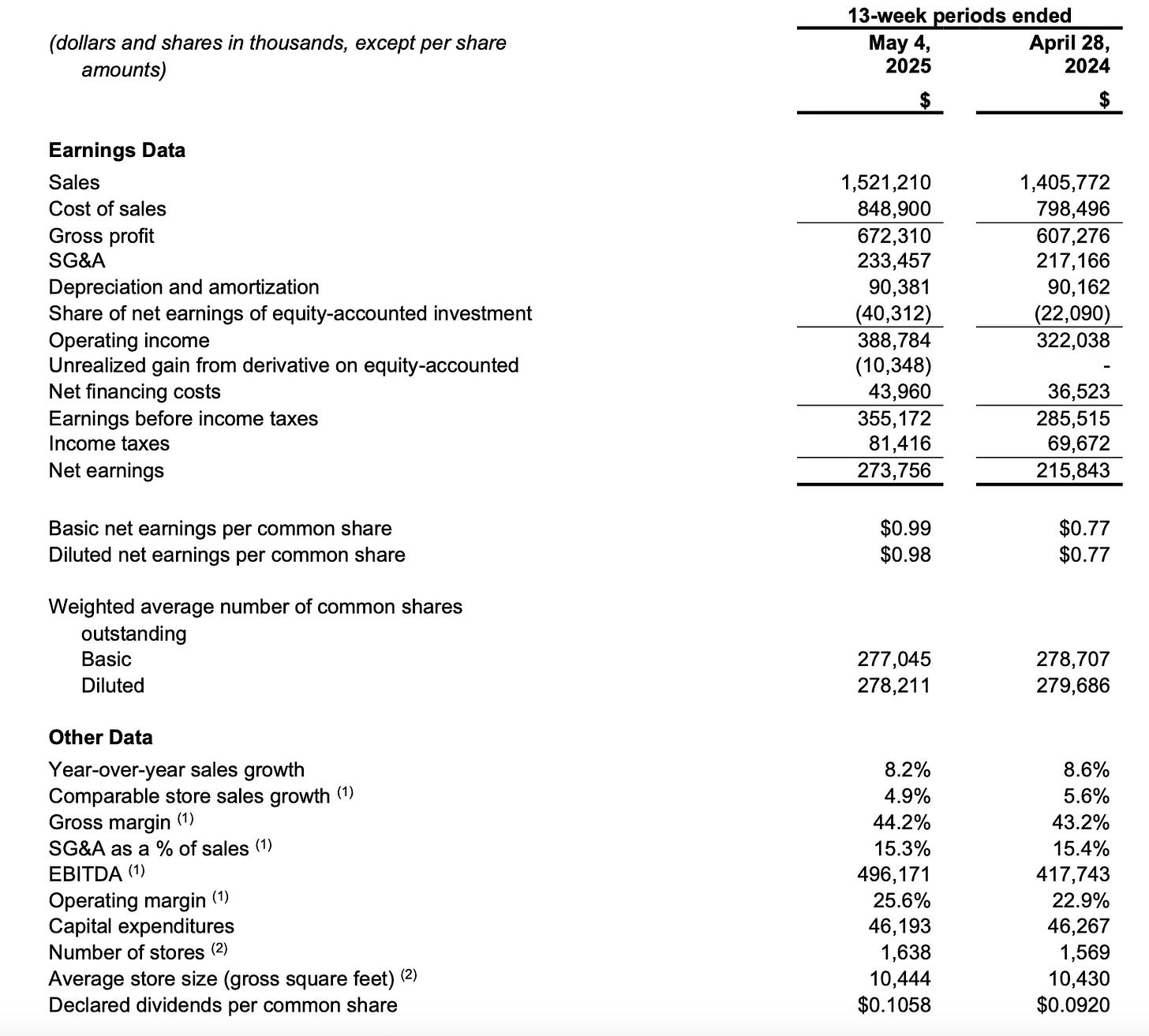 Today (June 11th. 2025), Dollarama released some very strong results as shown below for the last quarter:
