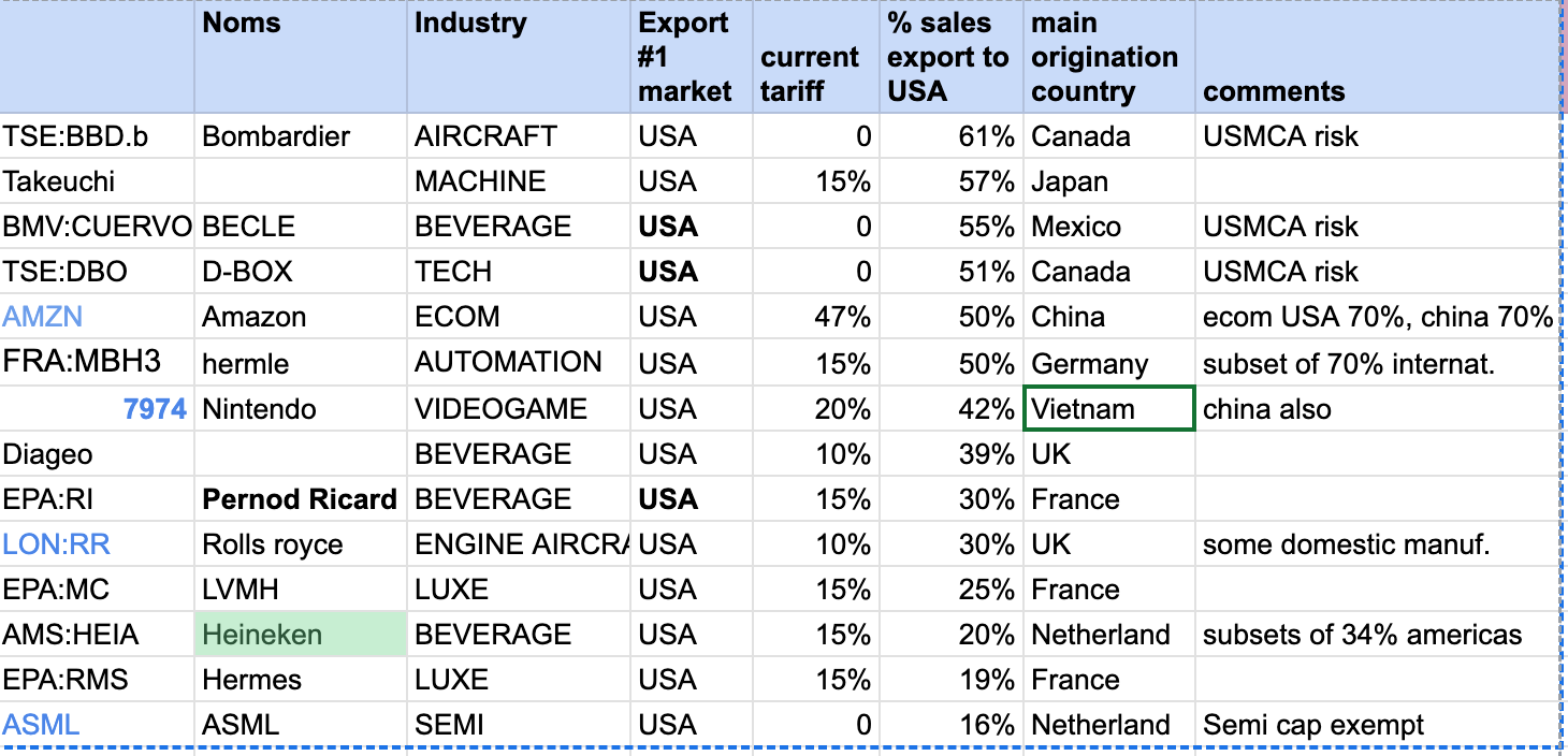 I did a quick pass today and ranked my holding based on the % of goods sold to USA. I excluded companies sellling mostly digital goods or USA domestic companies or companies which are mostly operating for their domestic market (Okano Valve) or which USA is marginal market.