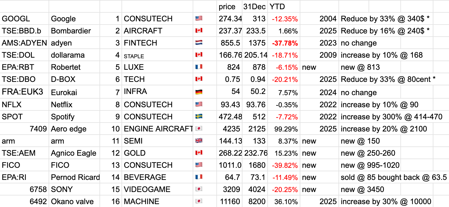 The following table shows the top portfolio holdings. I included the industry it is operating in, the current price, the price at the closing of December 2025, the YTD performance, the initial year of acquisition and related trades.