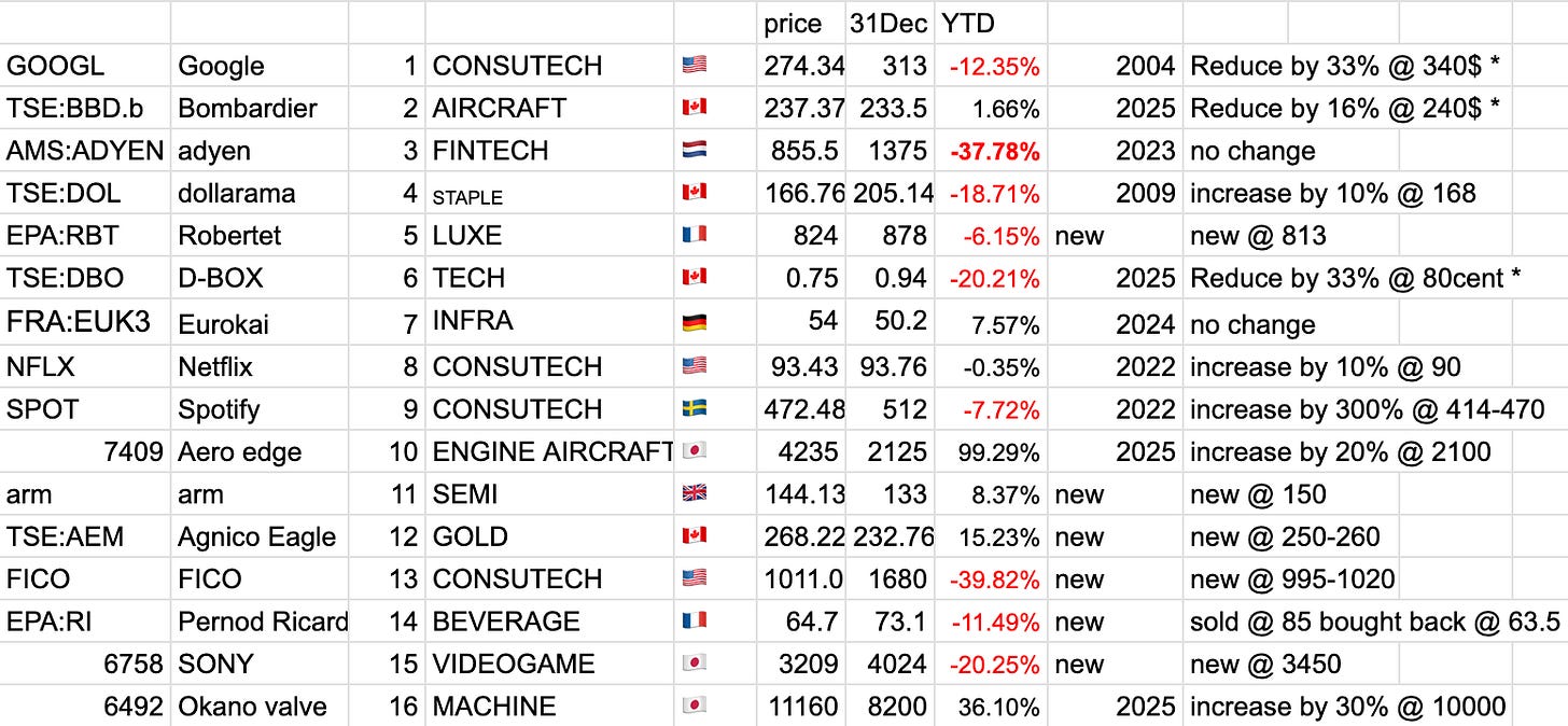 The country split of the top positions is more diversified than ever. It was not the case a few years back. At the start of 2024, I was mostly invested in USA, with 10 positions. Although anecdotic, I am observing that for the 30-40 consumer centric companies that I follow, these companies are negatively impacted by the health of the USA consumer market. The political and economical division inside of America is not helping. I am particularly concern by the decline in purchasing power of the American middle class. As such, I decided to recenter around markets that I am comfortable with but outside of USA, markets that often provided more value and with less internal division, namely Canada (4), Japan (3), and Western Europe (6).