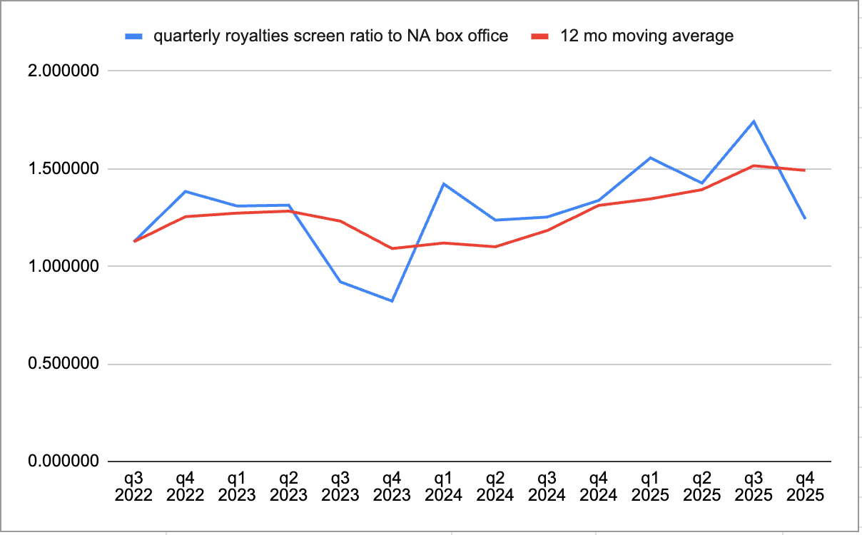 Based on the preceding points, an optimistic forecast - if management keeps hitting on all cylinders like they just did - could see an increase of 20% on the number of screens for Q2 2026 and onwards, an increase of 10% box office, and possibly a 5% increase in the ratio of royalties per screen over the Box office numbers.