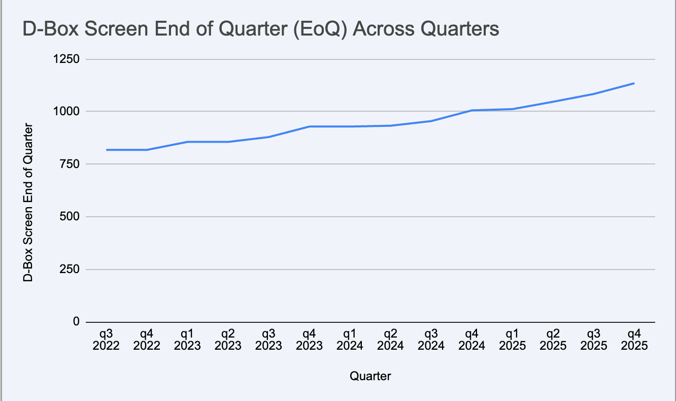 Naveen Prasad became CEO in April 2025 and he hired in November an ex-Sony Pictures executives Scott Sheer. My understanding is that the current CEO is traveling almost non stop to meet cinema operators to drive get new screens to get D-Box seats installed. It shows in the results, as 80 new screens were equipped in the December quarter, a record which represents a 7.5% increase in the number of active screens in just one quarter. The effect of the CEO - think Alain Bouchard ! - on a microcap can be so significant. A recent Scuttlebut investigation from Jon Cukierwar from Sohra Capital where he surveyed the number of screens for Cinemark alone, has shown an increase 118 screen since end of October. Since Hoyt’s cinema also likely rollout a good amount of screens in those 2 quarters, - Hoyt’s announced in June 2025 the addition of 539 new D-Box seats for the next 12 month, if we take Jon mid-range estimate and add 10 screens from other operators, we could get to close to 70 screens in Q1. In this case, we would be firmly in the 15%-20% increase range of new theater screens in the past 12 month. This would be a sharp acceleration thanks to the new management.