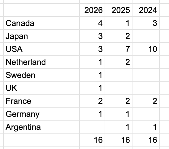 Below is the country split of the top positions now and at the start of 2025 and 2024: