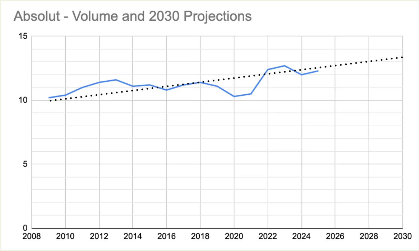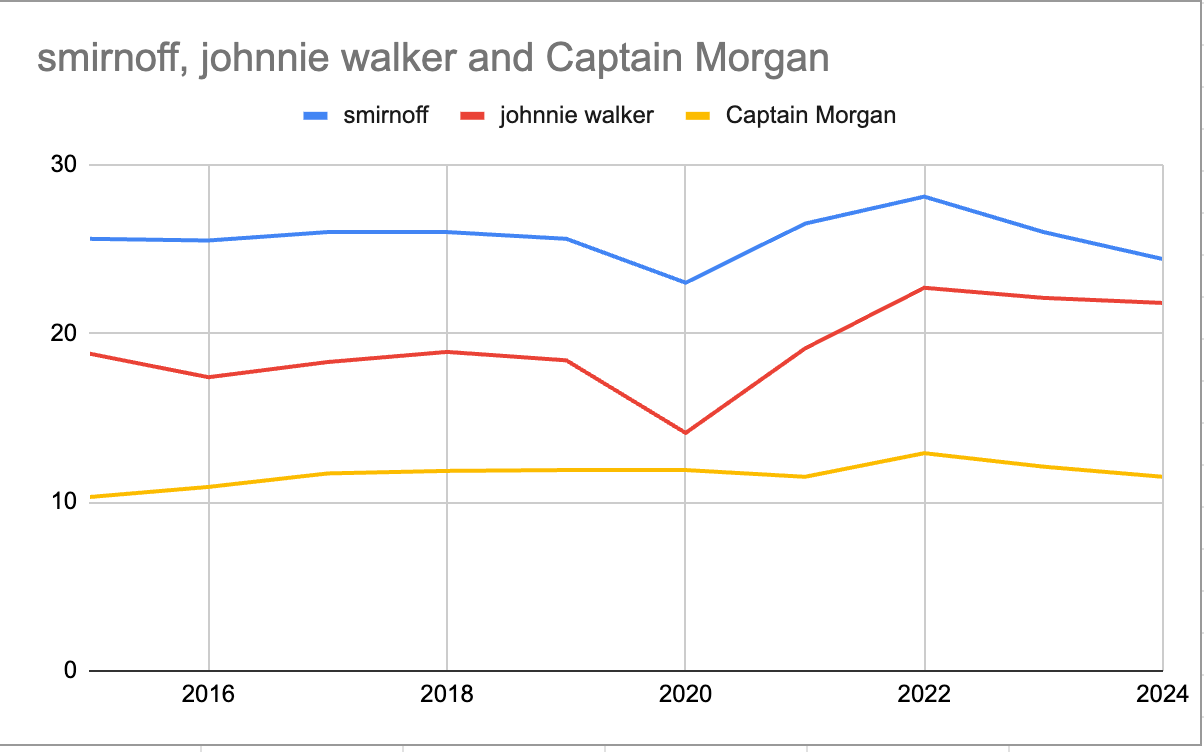If you take the largest brand in terms of volume, Smirnoff, the 2015 volume was actually slightly higher than the most recent numbers (2024). It is unlikely that this brand will grow significantly over times. In comparison, Absolut has half the volume but is a more premium vodka brand, often priced almost twice the price of Smirnoff. Absolut’s has risen by 2 million cases since 2010. A bit cyclical but with long term growth.