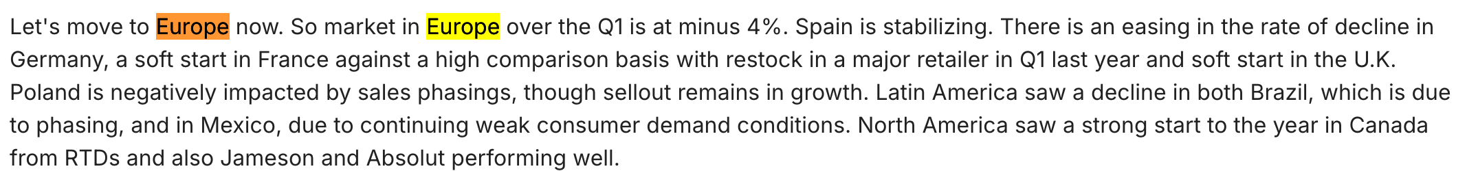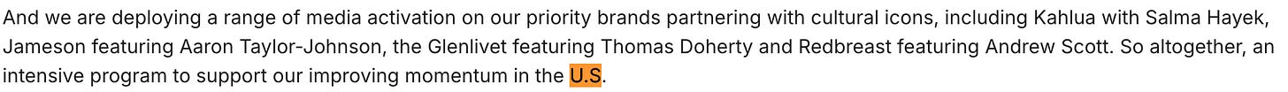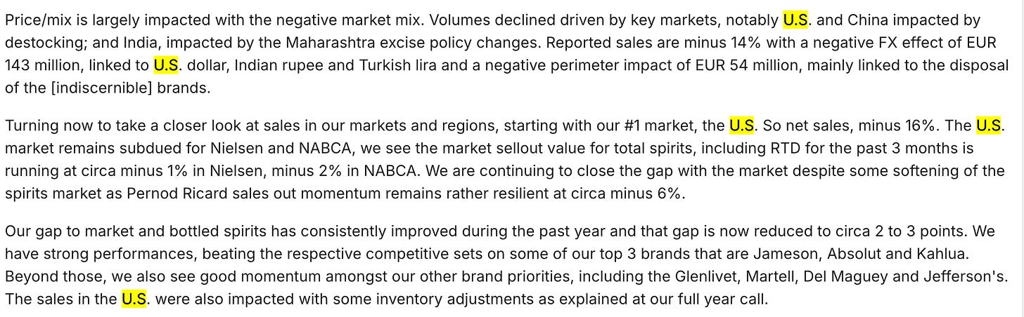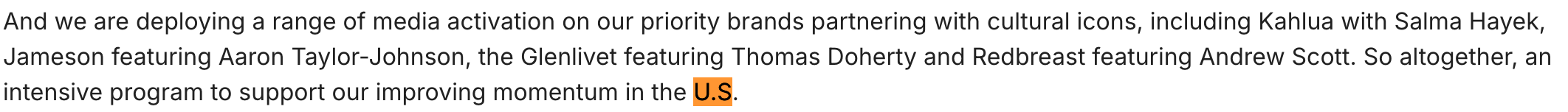 Jameson, Absolut and Kahlua are the top 3 brands for Pernod Ricard in the U.S. and performed well. Although I suspect strong headwind from inventory adjustment. Note that Kahlua is not longer considered a strategic international brand bucket since mid 2010s. It is part of the strategic local brands. They are pushing Martell into U.S. and Glenlivet is the #1 single malt brand in U.S. so these brands should go well. I suspect weakness for blended scotch brands (Ballantine, Chivas). RTD portfolio is strong.