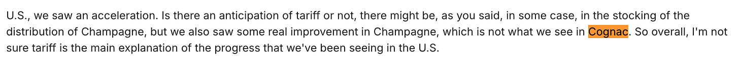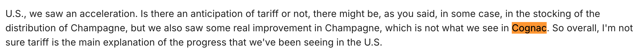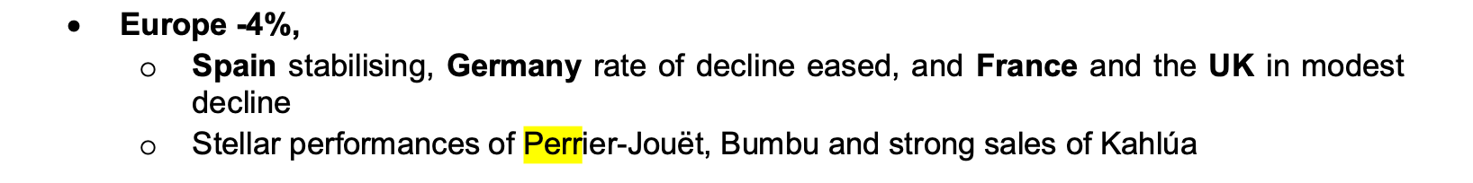 The Spirit business seems like a landslide. Supernova is a little bit too strong but Champagne is rebounding from weak 2024 numbers. LVMH has stated this week that Champagne and Wines (Rosé) have improve significantly in Q3 - up 7% organically. For 9months, it is organically up 3%.