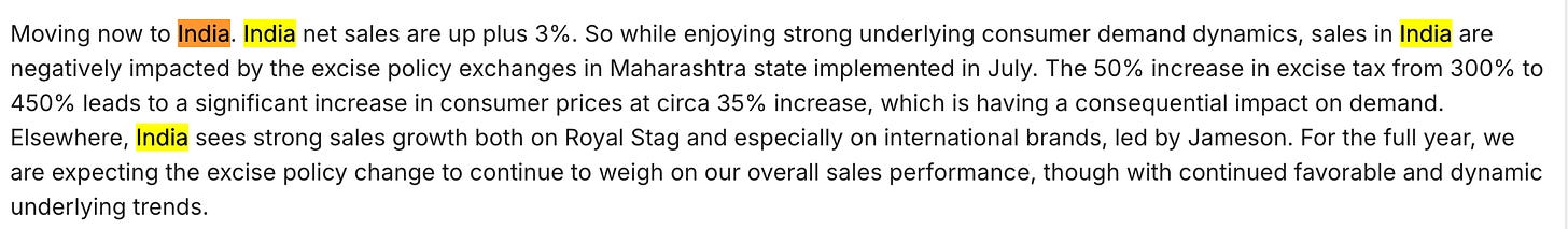 India organic sales is up 3%. Price of alcool increased 35% in the state of Maharashtra due to a 50% increase in excise tax. Mumbai has 20m people.