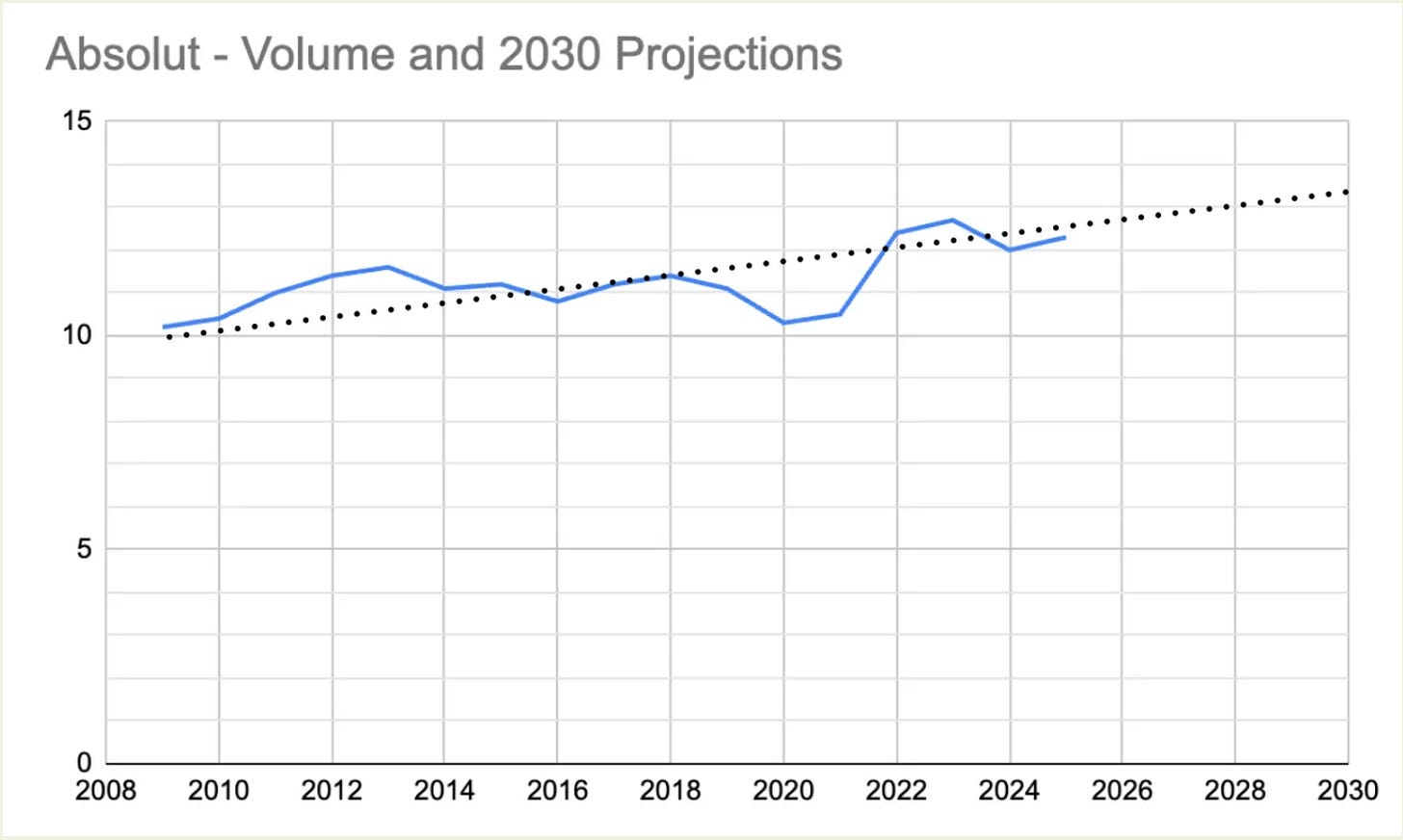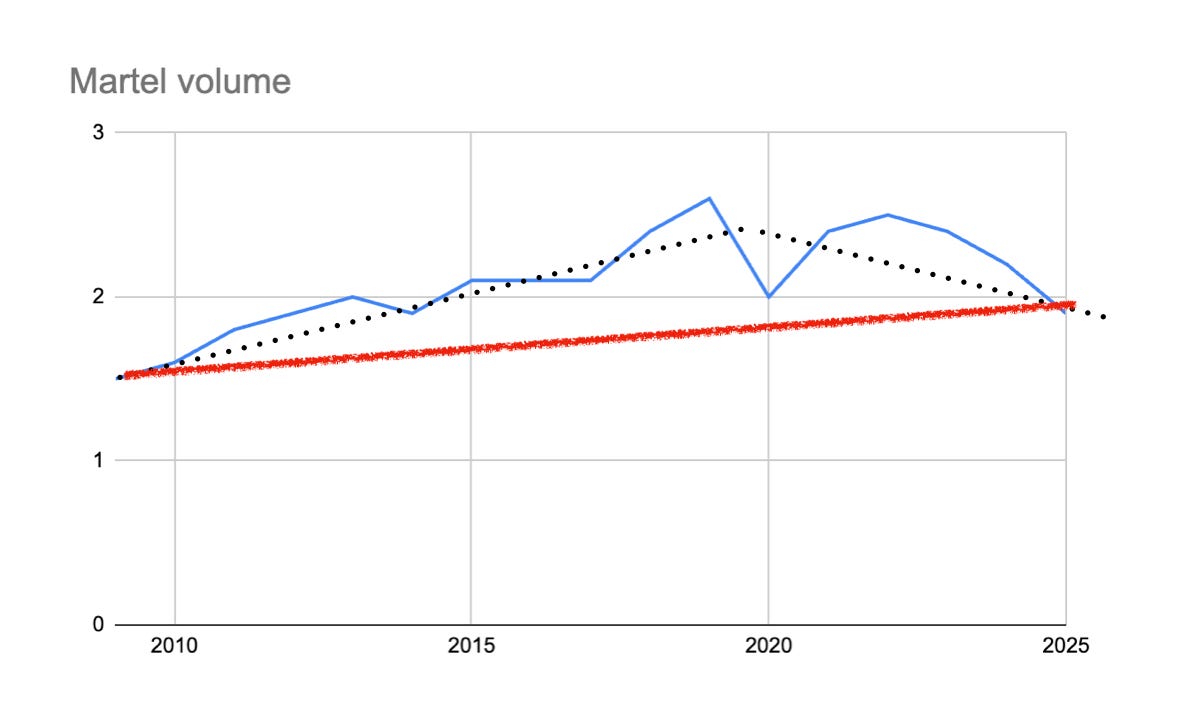 We have a 9 years uptrend (with up and down) followed by a down trend that has been lasting 3 to 4 years. What will happen it 5 years, I have no clue. Will cognac sales continue to decline for another 5 years, will it stabilize or will it go up and resume the 2009 to 2025 red line - I doubt. So definetely, my confidence level of predicting what volume we will see in 2030 is very small. Probably a range between 1.3m and 2.2m.