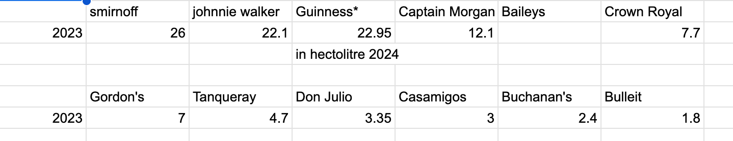 Diageo doesn’t disclose the volume nor sales of their top brands in contrast to Pernod Ricard. However I did look for estimates through independent market research source. Here are some numbers: