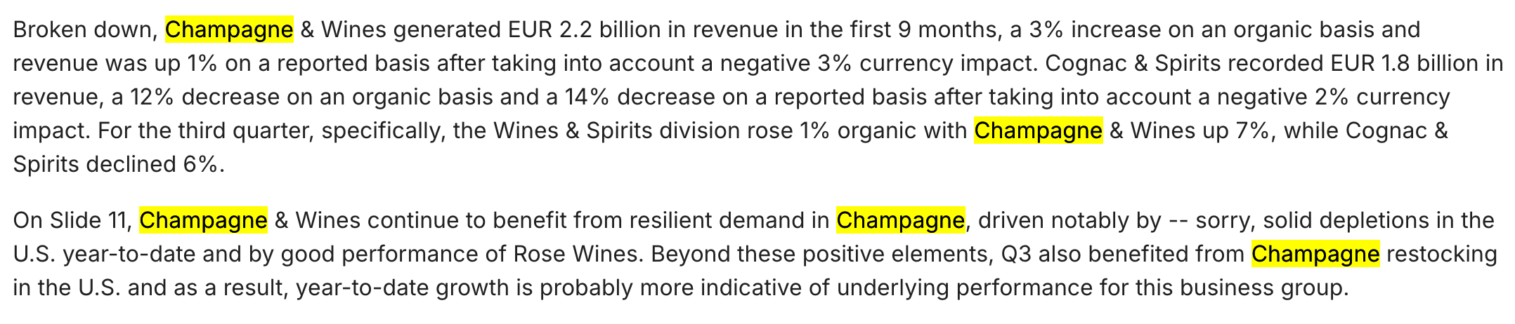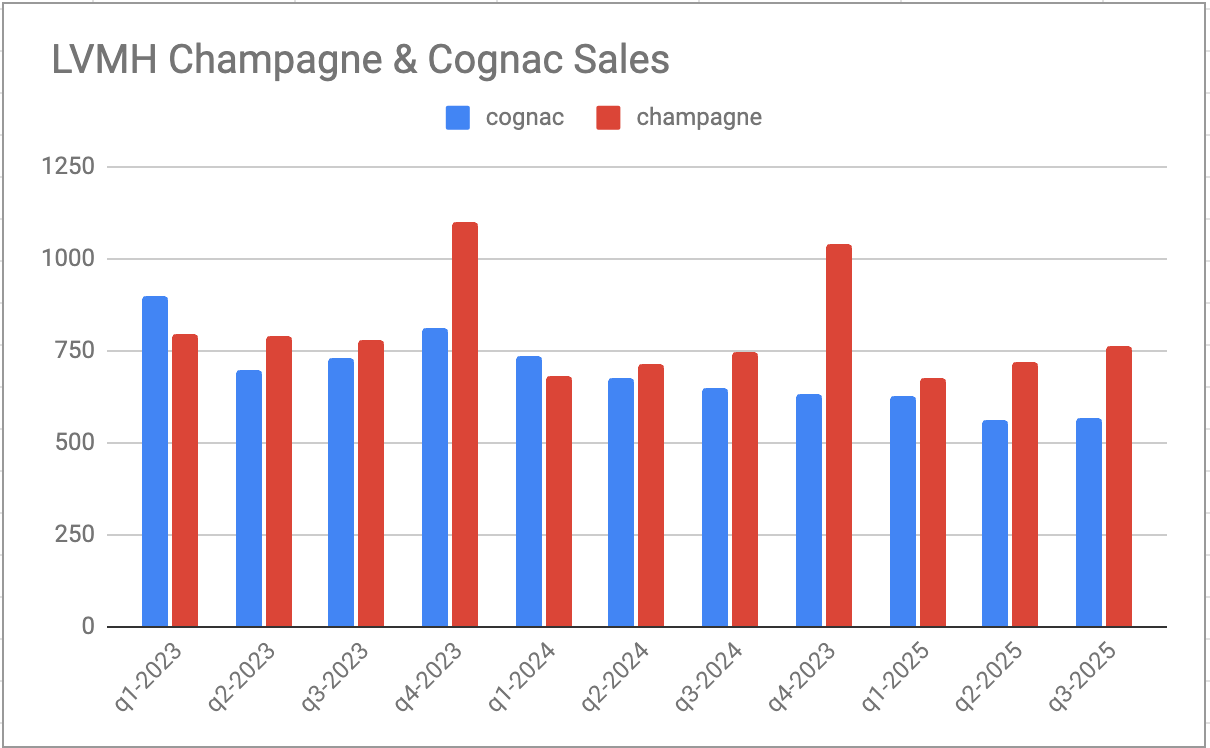 In contrast, the cognac spirits segment - Hennessy represents the vast majority of LVMH Cognac Spirits segment - saw a decline of 12% organically for the first 9 months and 6% in the latest quarter. Cognac is faced with a sharper decline than the Spirits market overall.